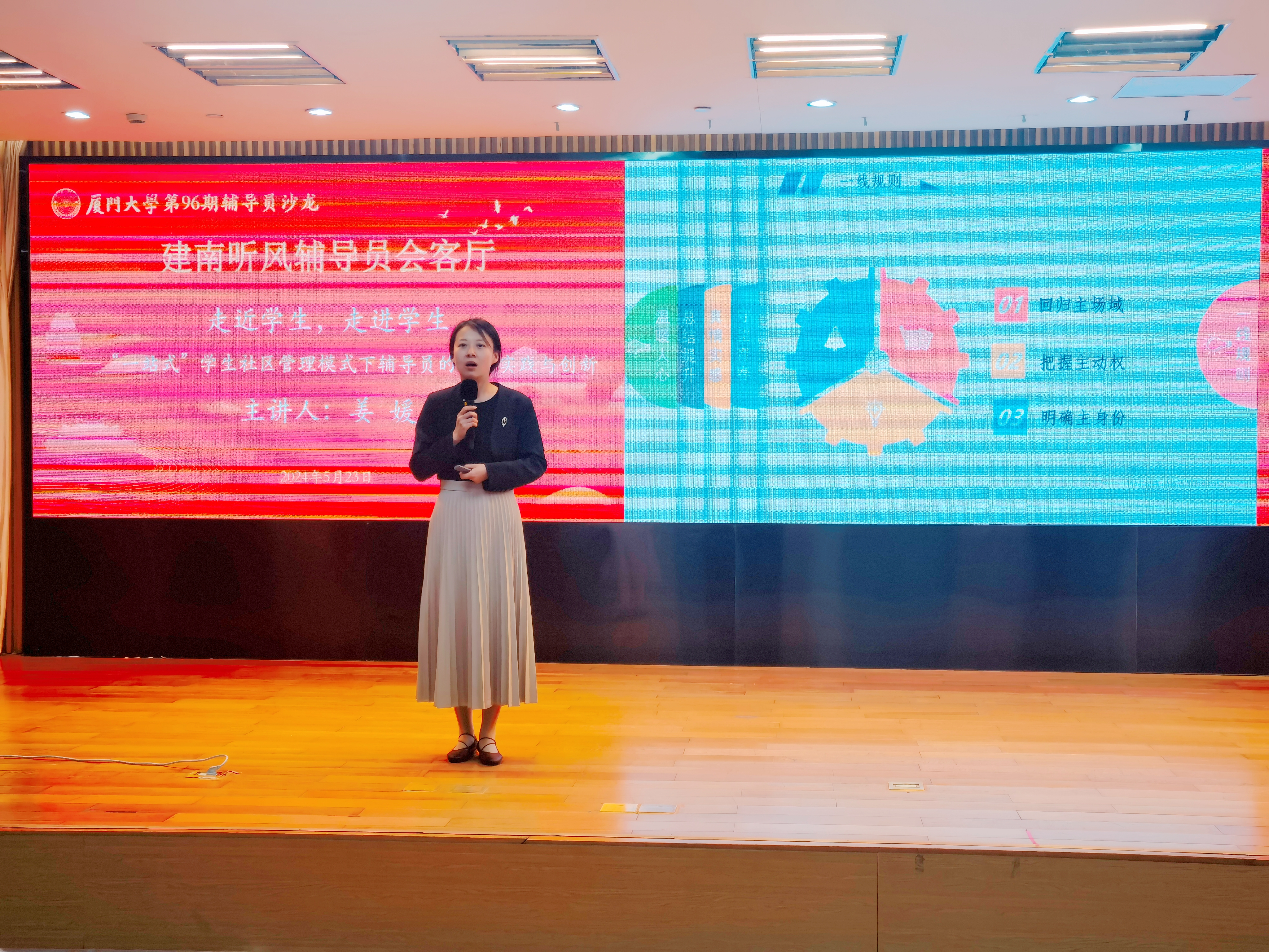 2024年5月22日-23日,厦门大学第95期、96期辅导员沙龙在科学艺术中心多功能厅举行。北京师范大学国际中文教育学院党委副书记、2019年“最美高校辅导员”(全国首批)、第八届“全国高校辅导员年度人物”任雅才,东北大学辅导员、2023年“最美高校辅导员”、第十四届“全国高校辅导员年度人物”姜媛分别做客“建南听风”辅导员会客厅,分享立德树人道路上的“最美”育人故事。