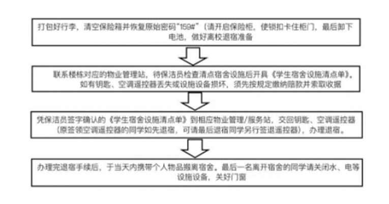 1.毕(结/肄)业生须于7月2日17:00前到后勤集团学生公寓与环境服务中心各物业管理站办理退宿手续并搬离宿舍,流程详见《思明校区2024年毕业生退宿手续办理流程》;