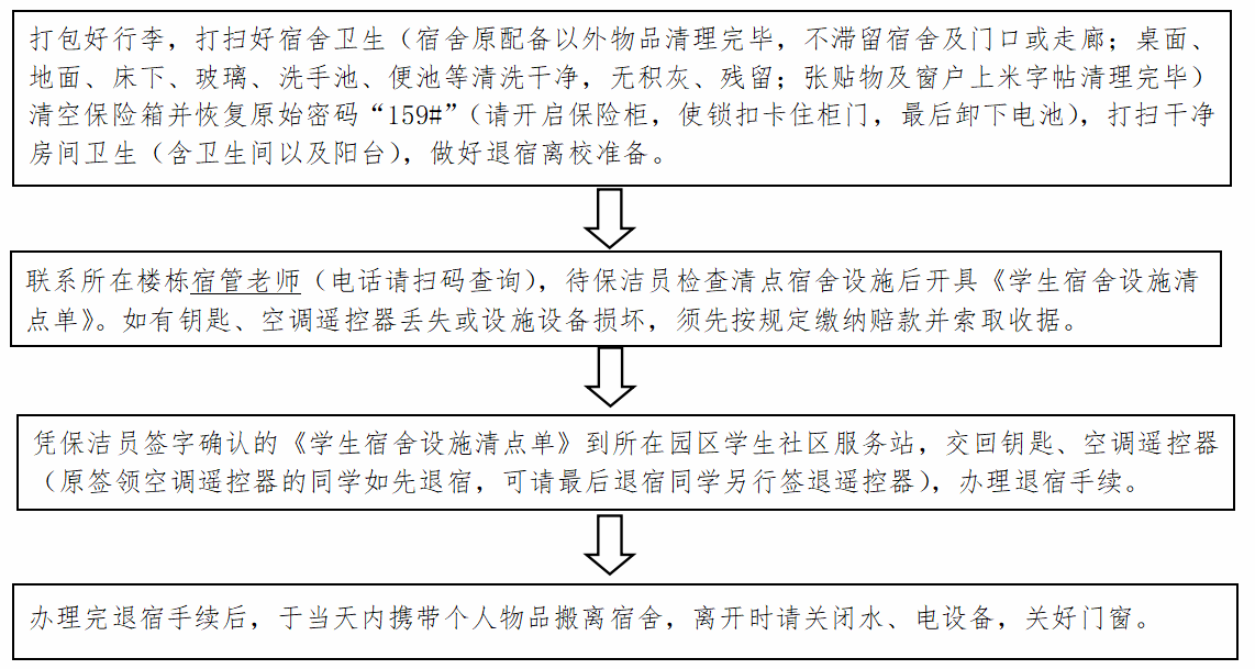 3.及时带走并妥善保管好个人财物,请勿滞留宿舍,以免被清理造成损失。若因滞留宿舍而导致个人物品被清除的,损失由学生个人承担。