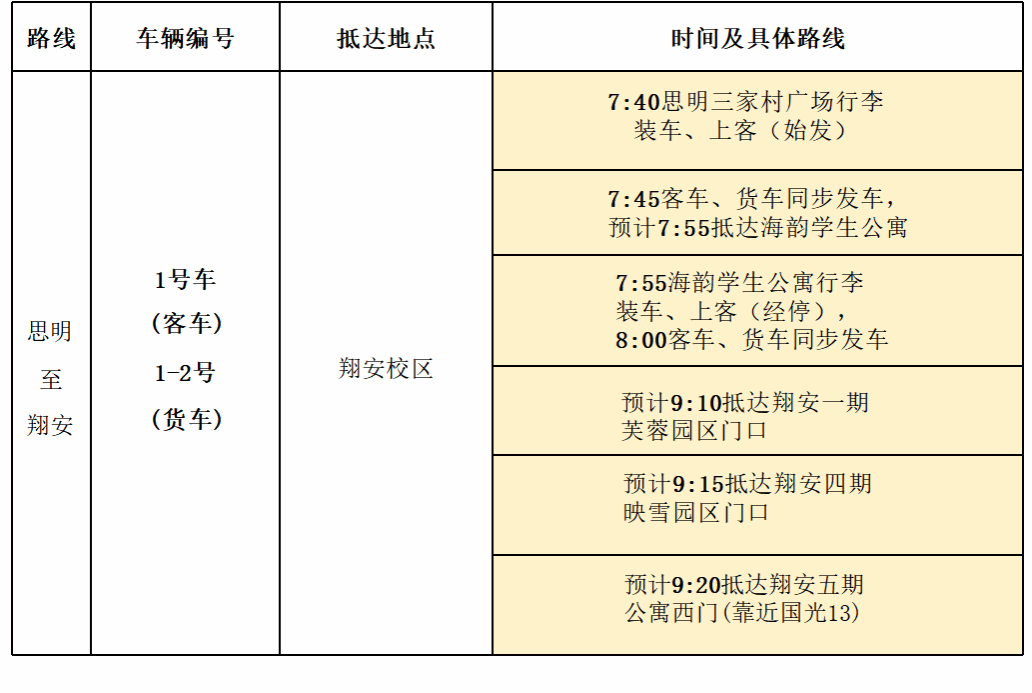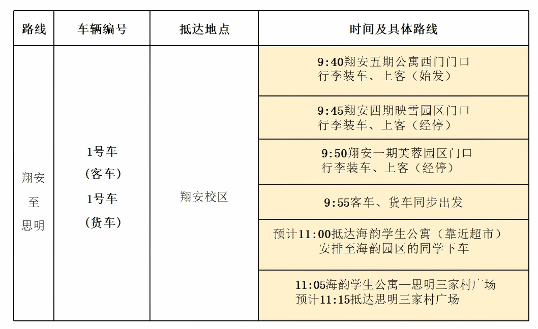思明校区调往翔安校区学生需提前一天(即2026年1月9日)到物业管理站办理退宿手续,并于2026年1月10日按下表安排乘车前往翔安校区。