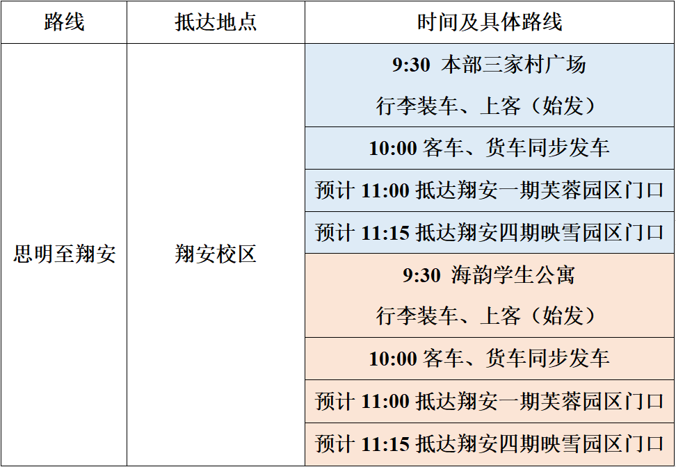 思明校区调往翔安校区学生可提前一天(即731日)到物业管理站办理退宿手续,并于81日按下表安排乘车前往翔安校区。