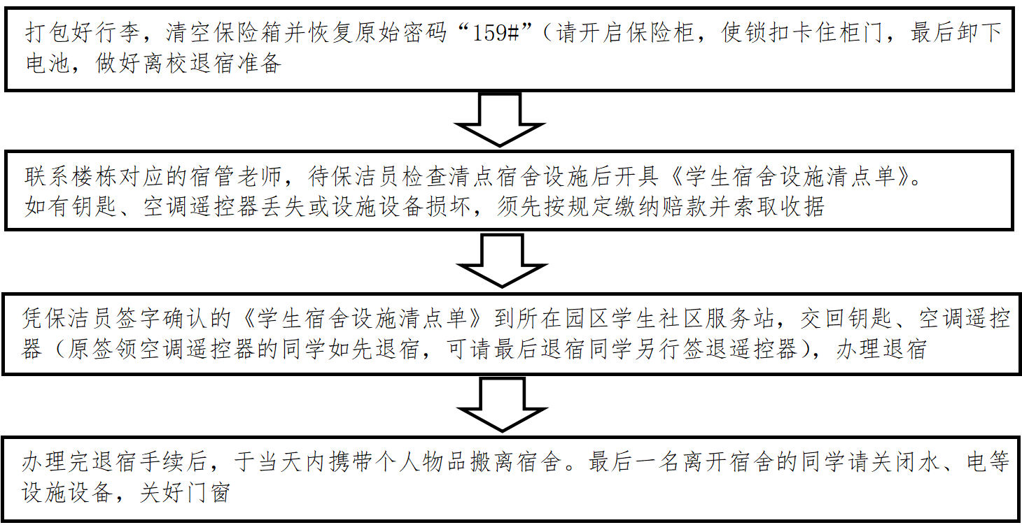 1.毕(结/肄)业生须于6月27日—6月30日到后勤集团学生公寓与环境服务中心各物业服务站办理退宿手续,流程详见《翔安校区2022届毕业生退宿手续办理流程》;