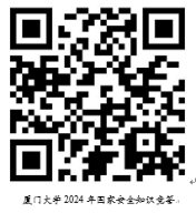 5.组织学生参加“厦门大学2024年国家安全知识竞答”活动。为引导大学生坚定维护国家安全,进一步营造国家安全人人参与、人人有责的氛围,学校决定举办2024年国家安全知识竞答活动,答题时间从即日起至4月15日15:00。请各院系鼓励同学们积极参与答题。答题得分前50名的还将获得精美礼品。具体获奖名单及礼品领取方式将在活动结束后在保卫处官网公布。扫描以下二维码即可参与答题。