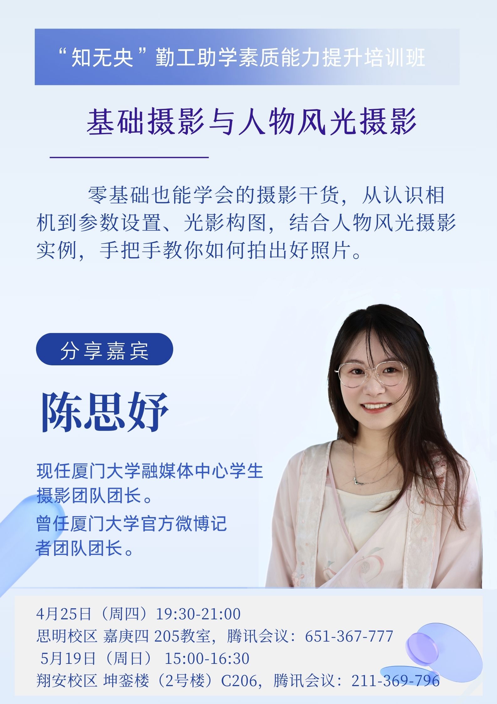 5月19日 (周日) 15:00-16:30 | 翔安校区 坤銮楼(2号楼)C206 | 基础摄影和人物风光摄影 | 陈思妤 | 现任厦门大学融媒体-学生摄影团队团长,曾任厦门大学官方微博记者团队团长。分享零基础也能学会的摄影干货,从认识相机到参数设置、光影构图,结合人物风光摄影实例,手把手教你如何拍出好照片。 |