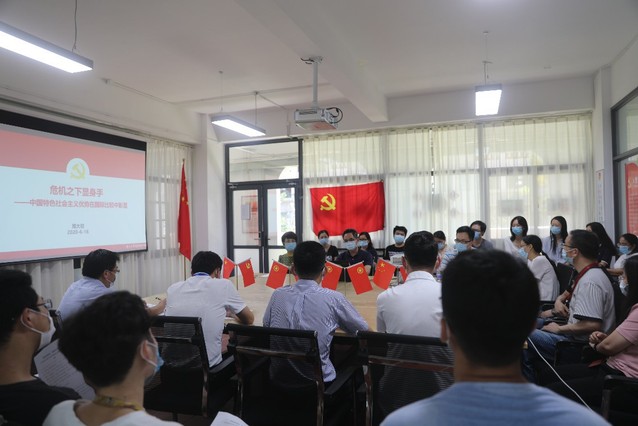 周大旺以《危机之下显身手——中国特色社会主义优势在国际比较中彰显》为题上了一堂生动的党课,他以自己海外求学经历为引,通过中美抗“疫”的举措对比,以小见大,深入地阐述了党始终坚持“人民至上、生命至上”的制度优势和体制力量,“把人民放在心中最高位置”落实在具体行动中。谈及如今中国迅速发展,中美差距不断缩小的同时,他指出了中国科技发展仍有不少方面依赖于国外,未来发展仍面临着不小的挑战。他表示,青年强则国强,希望在座的青年科学家和青年学子,能够充分理解中国特色社会主义制度的优越性,坚定理想信念,以无我的精神投身到科研攻关和祖国建设中。