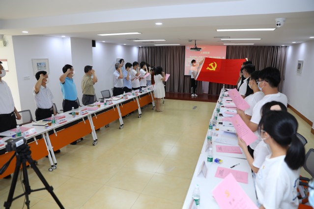 全体与会党员在吴国瑛带领下,面对鲜红的党旗,重温入党誓词。