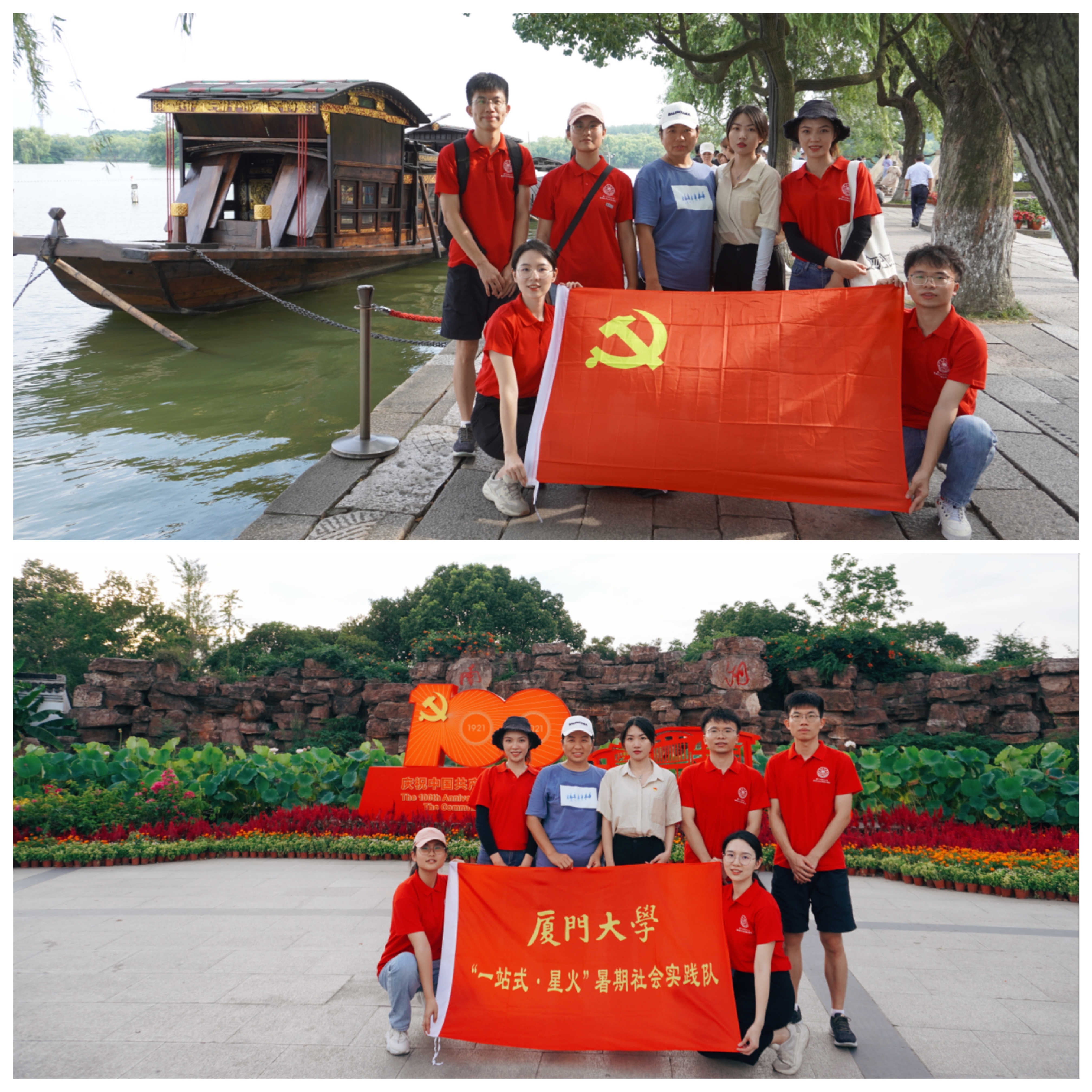 一百年前,13名平均年龄28岁的中共一大代表,在嘉兴南湖一叶小船上发出铿锵有力的声音:“中国共产党万岁!”,庄严宣告了中国共产党的诞生,从此使中国革命的历史翻开了崭新的一页。秀水泱泱,红船依旧。7月13日下午,实践队师生前往嘉兴南湖,瞻仰革命圣地,体悟红船精神。在南湖湖畔,重温红船的历史沧桑,追忆先辈的赤子初心;在烟雨楼上,眺望诺大的南湖,思索一叶扁舟所承载的复兴梦想;在南湖革命纪念馆,聆听百年大党的光辉历程,感受革命先辈开天辟地、敢为人先、坚定理想、百折不挠、立党为公、忠诚为民的“红船精神”。