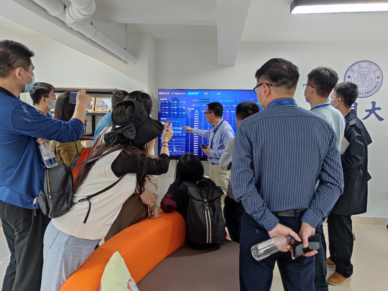在海韵14学习共享空间师生互动室,厦大“一站式”学生社区数据可视化平台建设概况引人瞩目,令老师们驻足认真观看。学生处副处长陈泗林以数据化报表形式展示我校学生社区入住情况、门禁情况、用电情况和学习共享空间信息化建设情况。
