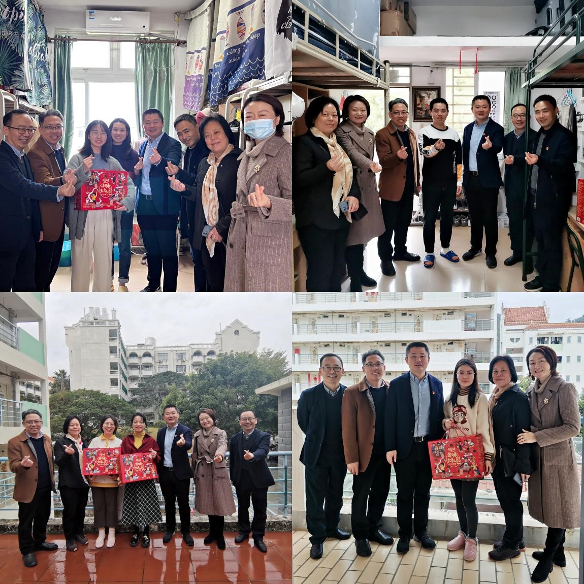 2022年春节将至,1月21日上午,新闻传播学院党委书记曾铮,党委副书记黄辉、李芬芬,副院长苏俊斌、陈素白,本科生辅导员胡长占、张锡臻,研究生辅导员林钰青深入学生宿舍看望慰问寒假全程留校学生,为同学们送去新春的祝福和学院精心准备的大礼包。
