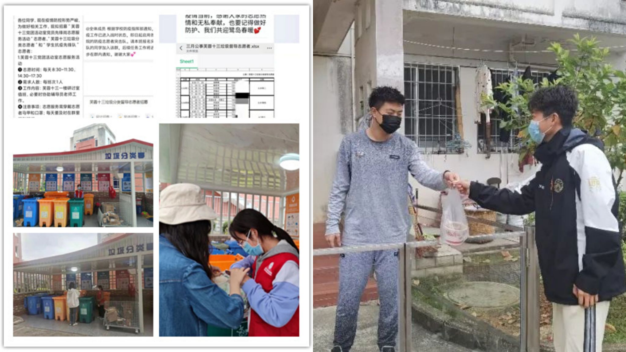 志愿服务显担当,互帮互助暖人心。为配合学校跑赢疫情、守护校园,学生党团员“疫”呼百应,积极参与疫情防控志愿服务,组建了一支党、团员抗疫先锋队,筑起一道坚实的“青春防线”。自学校封闭管理、食堂取消堂食等措施实施以来,学生社区生活垃圾明显增多,为保障良好的环境卫生,我院学生积极参加垃圾分类督导工作,在垃圾回收点引导、帮助同学们进行垃圾分类,为营造干净舒适的生活环境贡献自己的力量。隔离不隔爱,温情抗疫情,公事学子化身“派送员”,每天按时为居家健康监测无法出宿舍的同学们送饭,为同学的日常生活提供保障。