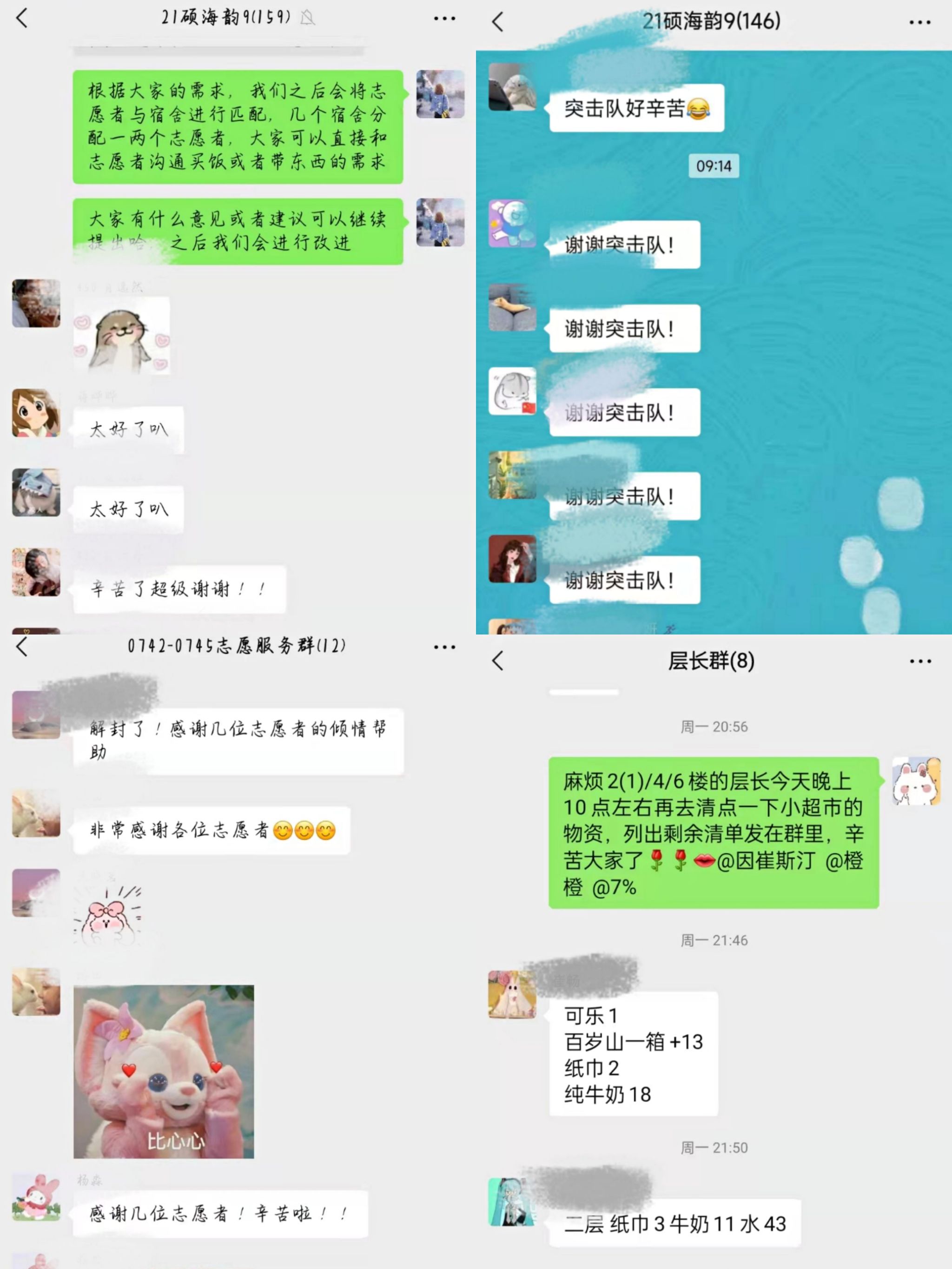 “我是党员,我可以!”、“我是层长,有事可以先找我!”、“感谢突击队!”。在重点区域楼栋内,楼长层长们带领68名志愿者积极开展分餐、核酸检测组织、信息维护等志愿工作。在重点区外,经济学院学生公寓党支部、经济学院志愿先锋党支部短短几个小时就组建了一支144名抗疫突击队,充分保障各类防疫物资、生活用品、学习用品的供应,实现戴口罩、无接触式配送,全方位满足学生实际需求。经济学院“一站式”学生社区自治管理委员会、经济学院学生公寓党支部不到一小时就将4300多份抗原检测试剂盒发放完毕。