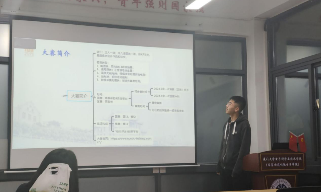 黄强开来同学分大赛简介、所需知识、如何准备三部分进行了分享。他针对大赛的题目类型、时间、奖项构成等进行了讲解,介绍了参赛所需要的软件、硬件和论文方面的知识,分享了电赛官网、公众号等方面的内容。他以自身的竞赛经历,提醒有意向参赛的同学早做准备。