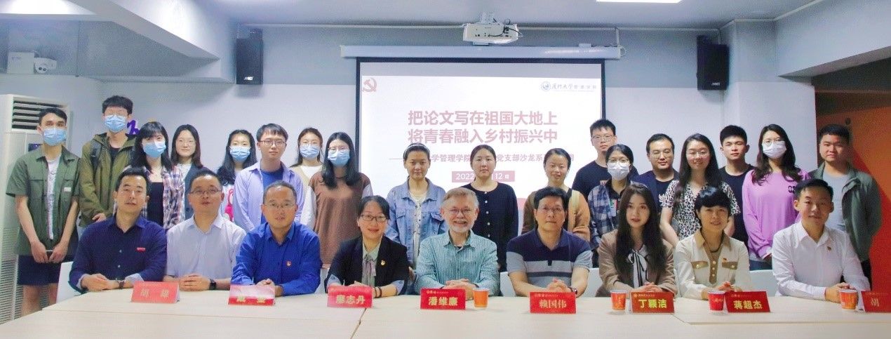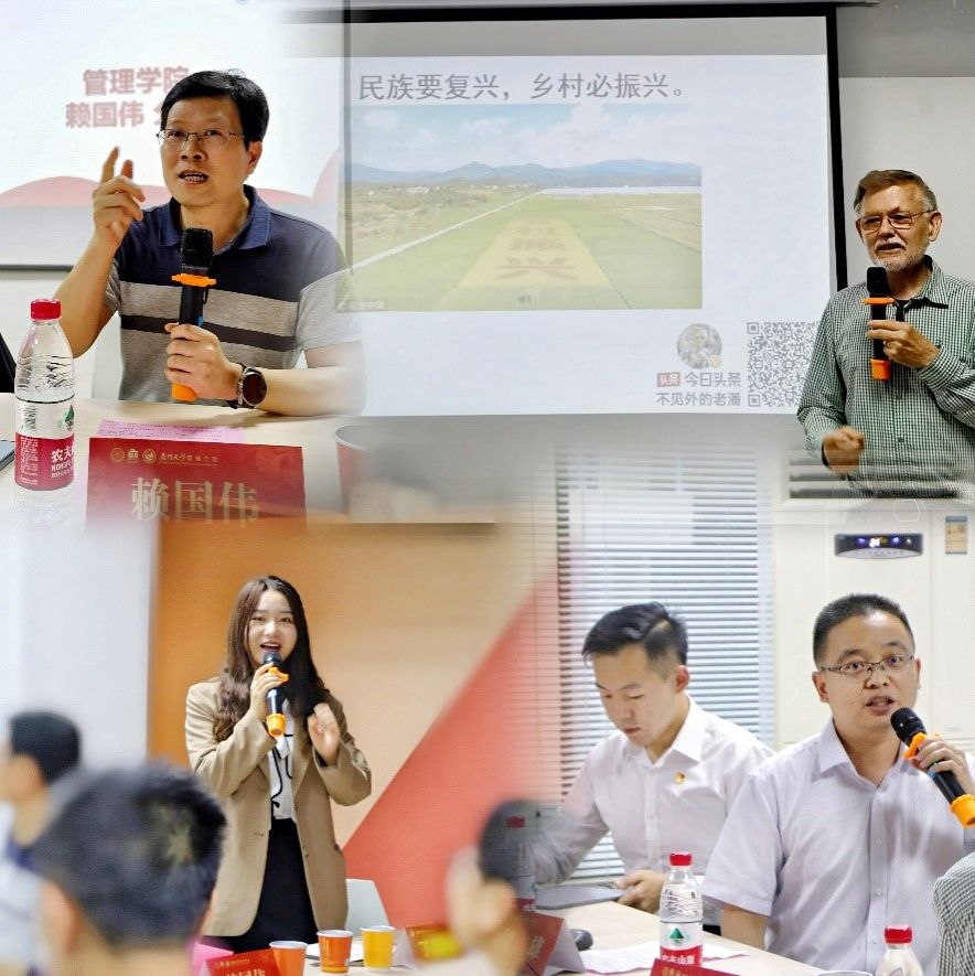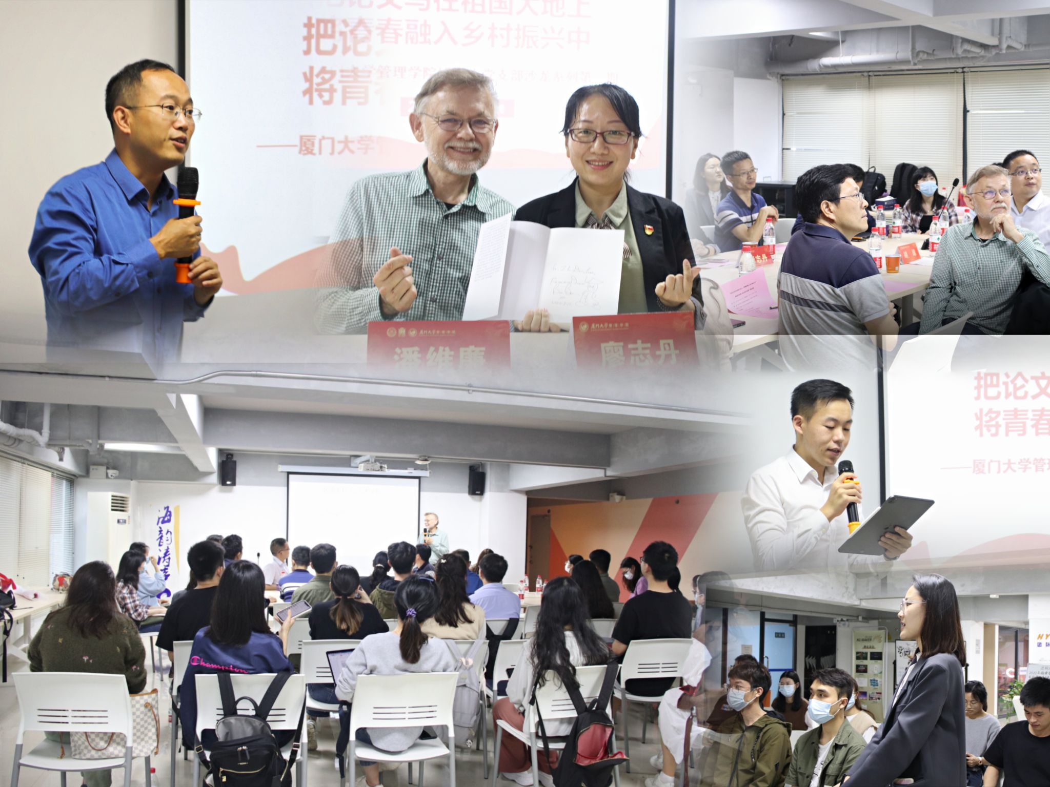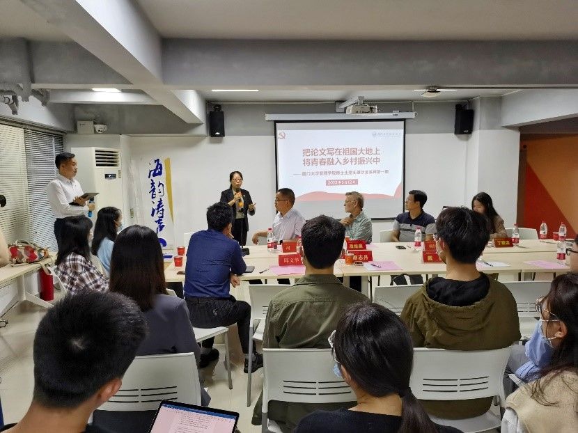 在海韵“一站式”学生社区里,正在开展的是厦门大学管理学院博士生党支部沙龙。首期沙龙邀请到对乡村振兴有不同经历、研究的代表,他们是:2019年感动中国人物、2次走遍中国的潘维廉教授,研究数字化转型与乡村振兴的赖国伟老师,原厦大驻宁夏隆德张树村第一书记胡雄老师,乡村志愿服务金奖团队青选至成员代表丁颖洁。他们结合自身经历同大家共同分享乡村振兴的目标、经历和过程,带大家走进基层中国。厦门大学党委党的建设办公室主任、党委组织部副部长廖志丹,校研究生院培养办副主任邱文华,管理学院党委副书记戴蓥,管理学院团委书记蒋超杰,管理学院团委副书记揭上锋出席活动。市场学系博士党支部全体成员和来自经济学院、马克思主义学院、新闻传播学院的博士生参加活动。活动由管理学院2021级市场学系博士生胡亮主持。