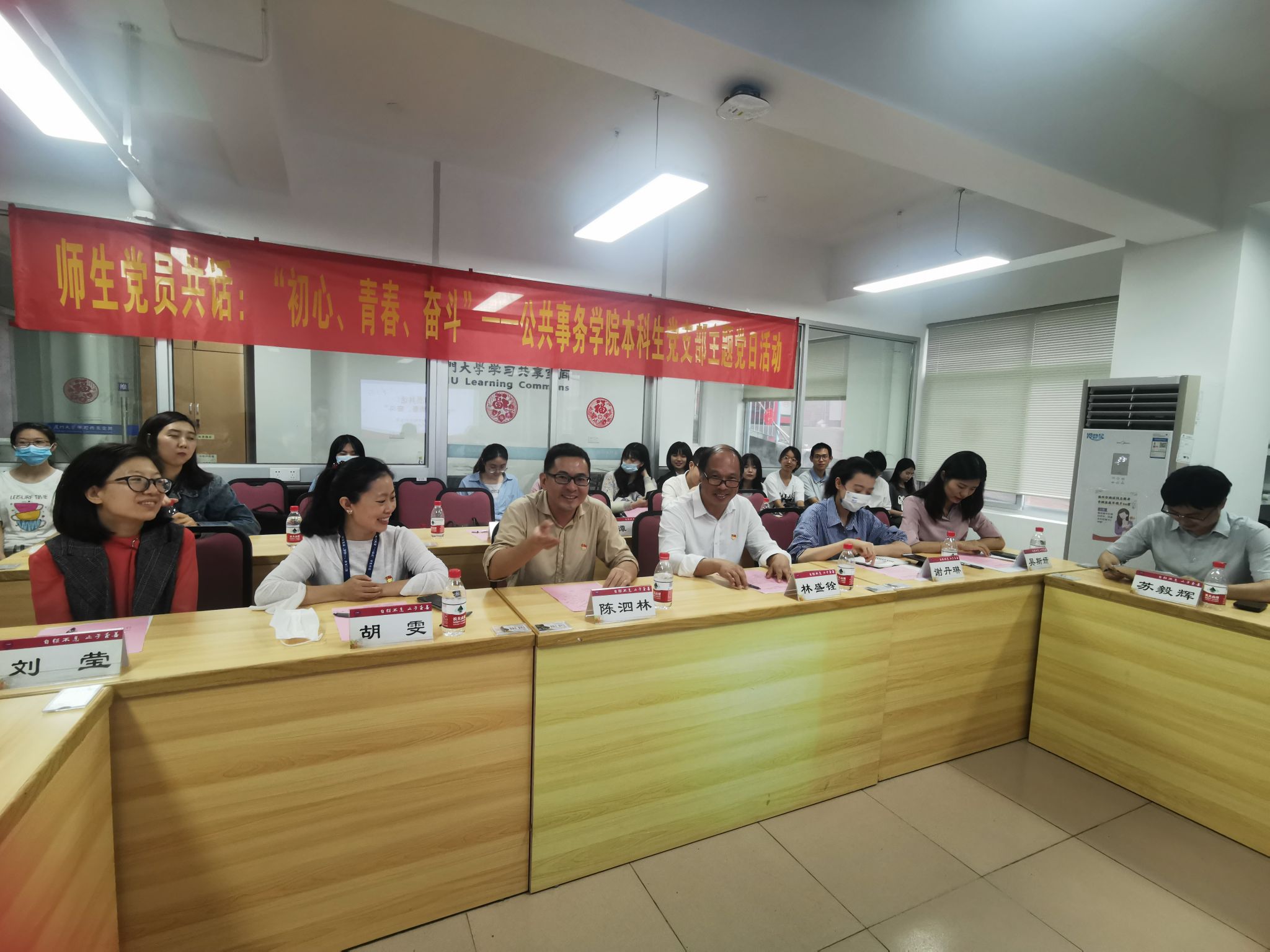 为不断深化新时代高校党建示范创建和质量创优工作,近日公共事务学院本科生党支部开展“师生党员共话:初心、青春、奋斗”主题党日活动。活动在芙蓉十三学习共享空间举行,学生工作处副处长陈泗林,公共事务学院党委副书记林盛铨,学生社区兼职辅导员胡雯、谢丹琳、吴斯妍、赖瑶,校团委刘莹,公共事务学院学工组成员徐莹、谭超、李思颖,党校机关党委联合党支部成员邱哲昊,“囊萤星火青年讲师团”成员,公共事务学院本科生党支部党员代表参加活动。活动由支部书记苏毅辉主持。