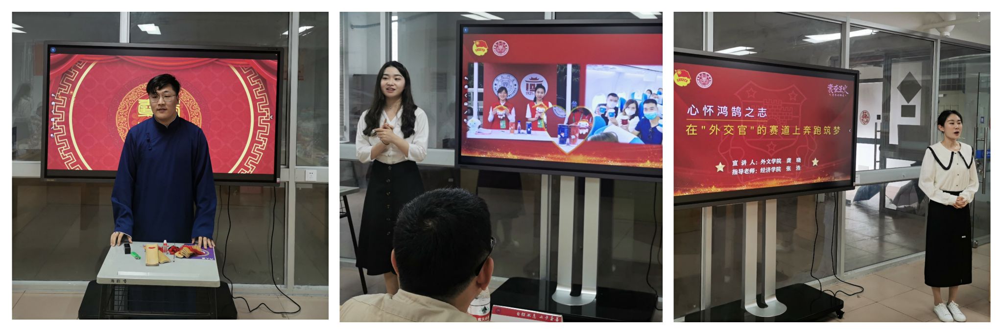 接着,“囊萤星火青年讲师团”成员进行青年微宣讲。党支部成员、公共事务学院2019级本科生商兆岩以“初心”为主题,宣讲了“烽火里的‘意外遇见’”,以相声表演的形式,讲述了校主陈嘉庚与中国共产党的故事,展示了党的初心和使命,号召青年赓续伟大的建党精神。管理学院2019级硕士研究生丁颖洁带来了以“青春”为主题的“让青春在乡村振兴的广阔舞台上‘起舞’”的宣讲,展示了青年学子在乡村振兴的广阔舞台上发挥专长、大显身手,号召青年扎根祖国大地做贡献。外文学院2019级本科生龚晓以“奋斗”为主题,立足自己的外交梦,以 “心怀‘鸿鹄之志’,在‘外交官’的赛道上奔跑筑梦”为题进行宣讲,号召青年大学生以先辈们为榜样,以奉献者为楷模,实现百年初心传承、信仰延续,为实现中华民族伟大复兴不懈奋斗。青年讲师们充分运用多媒体手段和讲演技巧,声情并茂,给现场师生们带来一场富含感动和启示的精彩宣讲。