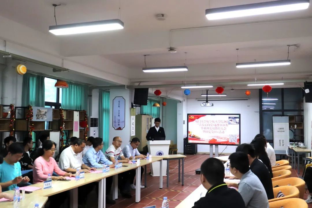 2022年6月9日,航空航天学院于翔安校区映雪5“一站式”学生社区召开“青春心向党·逐梦新征程”2022届毕业生党员教育大会暨“固定党日+”活动。校学生工作部副部长、校学生就业创业指导中心主任高斌,航空航天学院党委书记王康平、常务副院长尤延铖、院党委副书记张晴、院党委副书记林蔚,辅导员及学生党员代表参加活动。