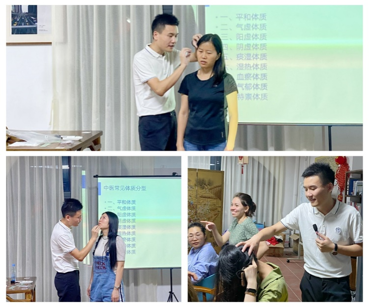 首先,李医生为大家介绍本次讲座的主题:中医体质辨识及养生。体质是指在人体生命过程中,在先天禀赋和后天获得的基础上所形成的形态结构、生理功能、心理状态等方面综合的,相对稳定的固有特质。中国人的体质大约可分为平和、气虚、阳虚、阴虚、痰湿、湿热、血瘀、气郁、特禀九种。李医生告诉同学们,每个人要依照自己的体质调理身体,克服不良生活习惯,培养保健意识。