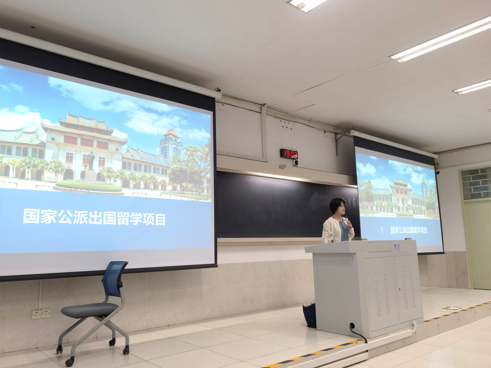 为更好地推进我校研究生教育国际化,加强研究生国际学术交流,拓展研究生国际视野,10月20日晚上,“研究生教育服务走进学生社区”主题讲座——国家公派出国留学项目说明会在海韵学生公寓教学楼举办。研究生院的陈权老师作为主讲嘉宾,与同学们面对面,详细介绍了国家公派出国留学政策,讲座由海韵学生公寓16楼栋工作组承办。这是学校针对2023年国家公派留学研究生项目举办的首场宣讲活动,吸引了近200人到场,现场座无虚席,同学们表现出很高的参与积极性。