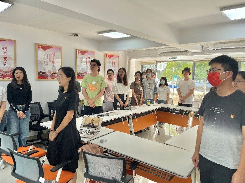 座谈会第一环节,学生公寓党支部书记王辉播放了中央广播电视总台关于党的二十大相关新闻视频,带大家重温党的二十大开幕会。视频播放至国歌跟唱环节,全体成员起立并跟唱国歌。