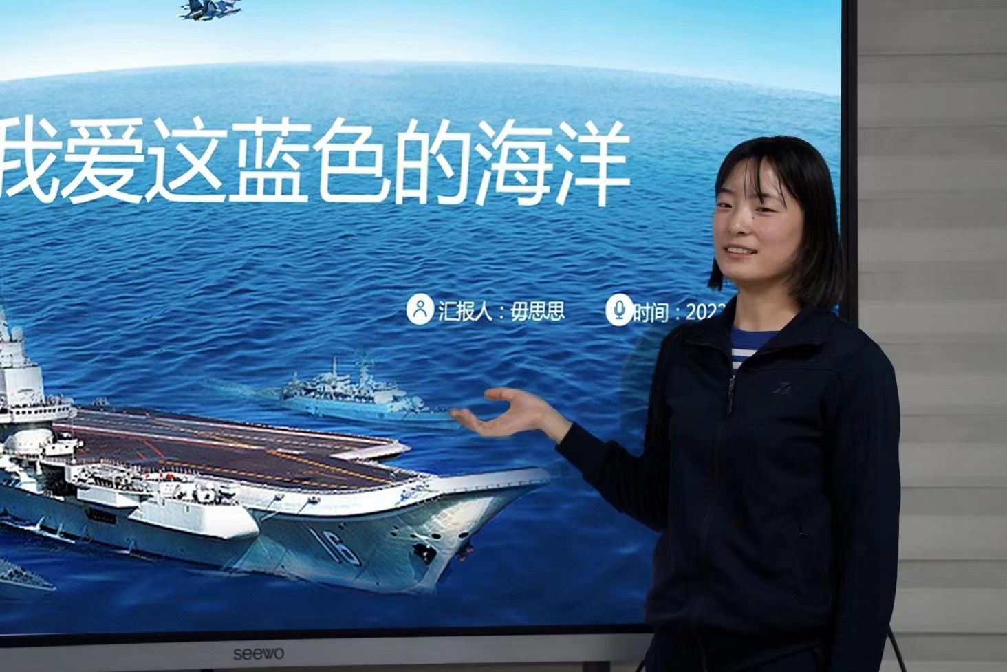 逐梦深蓝,向海图强。分享会上,毋思思从入伍初心、从军经历到军旅感悟,讲述了一名军人对蔚蓝大海深沉的爱。2017年,毋思思考入厦门大学公共卫生学院,2018年从军入伍,后服役于东海舰队海军沂蒙山舰,担任卫生员职务。在新兵连、学兵连的九个月,毋思思走队列、练战术、学救护、强体能,重点学习护理技术、战救技能、卫生防疫、中医理疗等卫生员专业知识。结业后,她被分配到了东海舰队071型船坞登陆舰沂蒙山舰担任卫生员,开启一年多的舰艇生活。毋思思说到,青春有很多模样,而我庆幸自己能在最美的年华一身戎装,潜航大洋,翱翔海天,逐浪前行。
