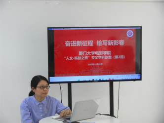 2022年11月20日上午,电影学院“人文—科技之桥”交叉学科沙龙(第2期)在海韵9“一站式”学生社区师生互动室进行。活动由电影学院党委副书记张晴主持,电影学院副教授李天主讲,线上线下同步进行。