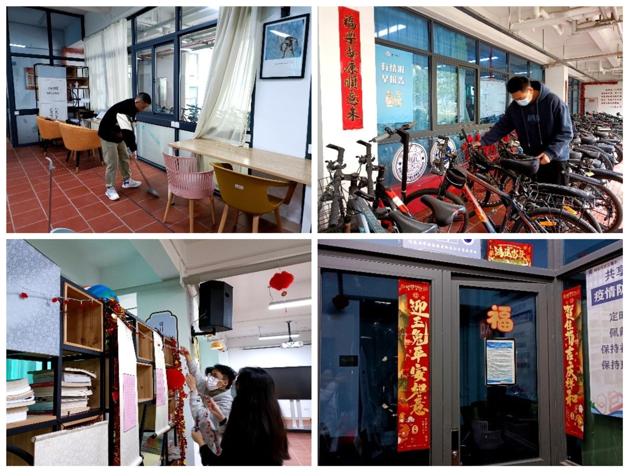 扫去一年尘晦,张贴新年新气象。“尘”与“陈”谐音,新春扫尘即“除陈迎新”。当天下午,留校同学在映雪、博学的宿舍、“一站式”空间积极开展除尘布新等工作。整理自行车、扫地擦玻璃、整理桌椅和书架,同学们将去年的春联换下,贴上对新一年的美好祝愿。