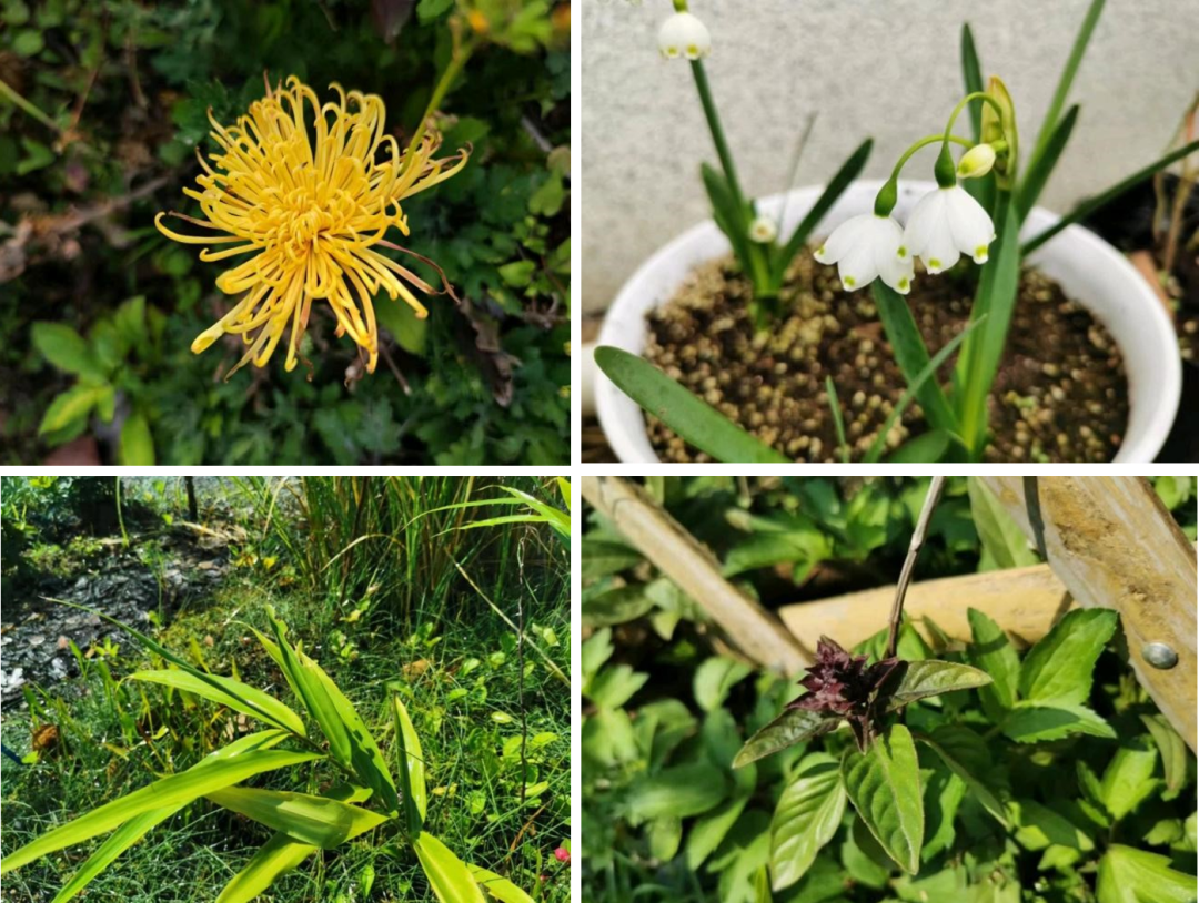 图 | 部分八闽药园植物,从左由右从上到下为:菊花、雪滴花、砂仁、罗勒