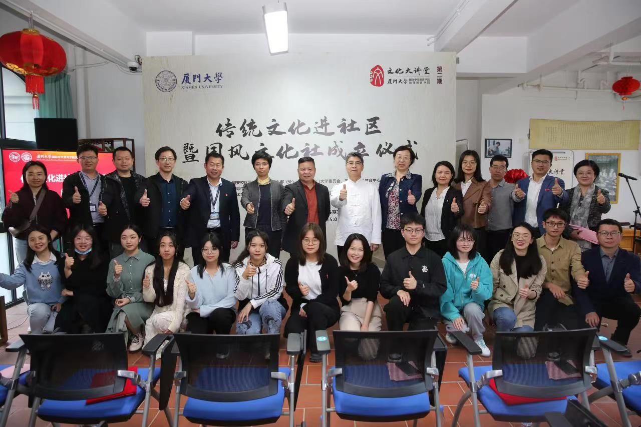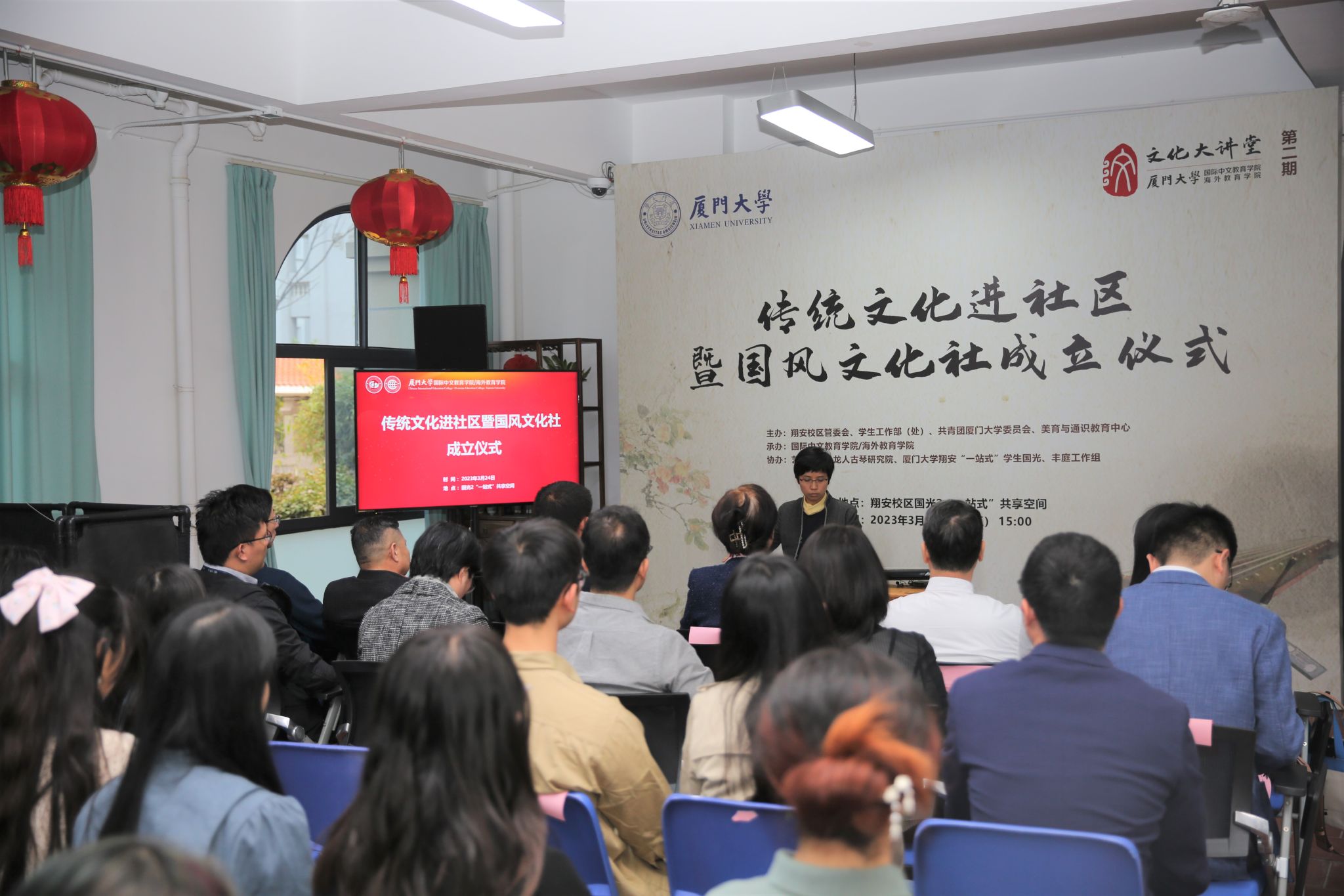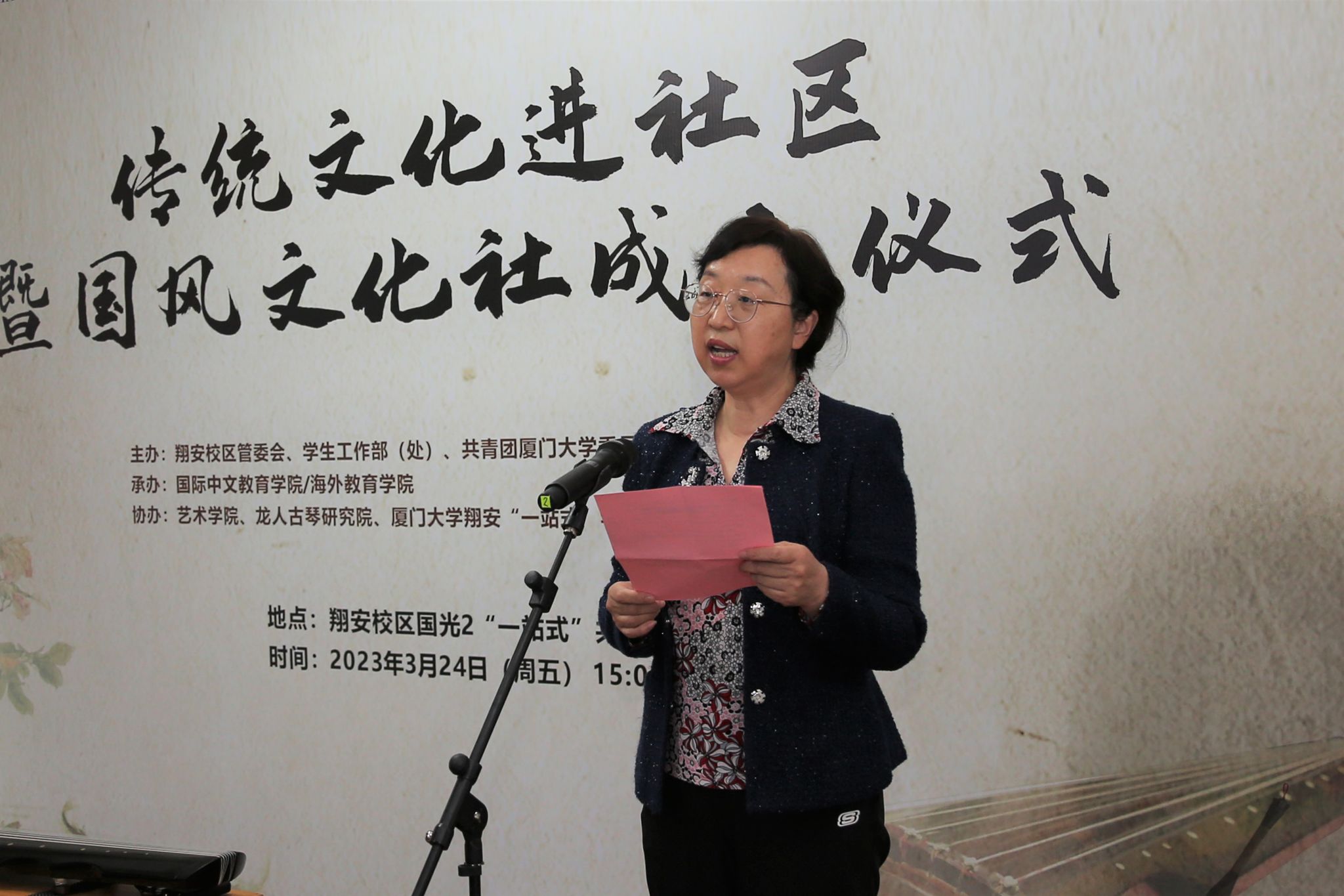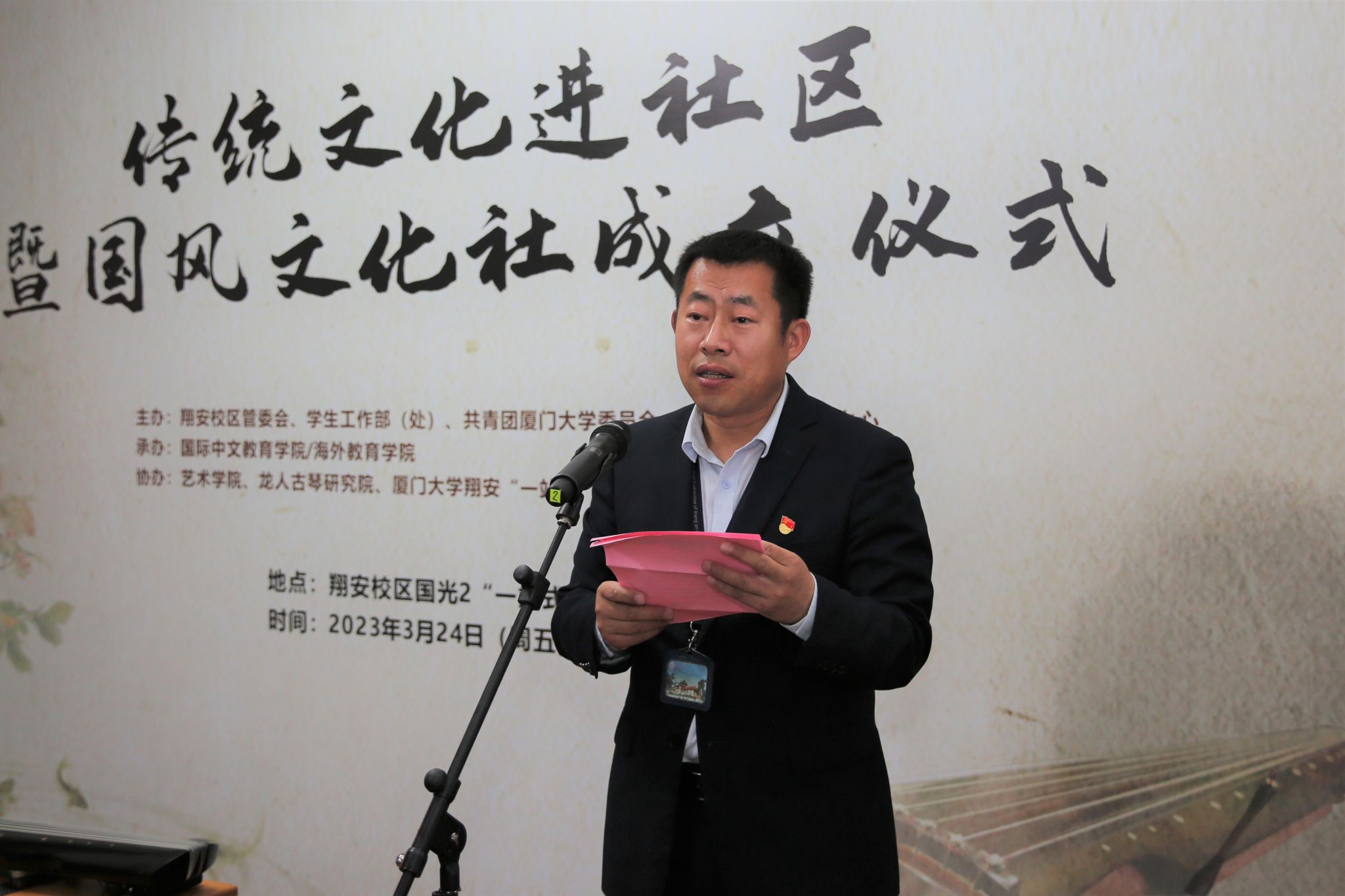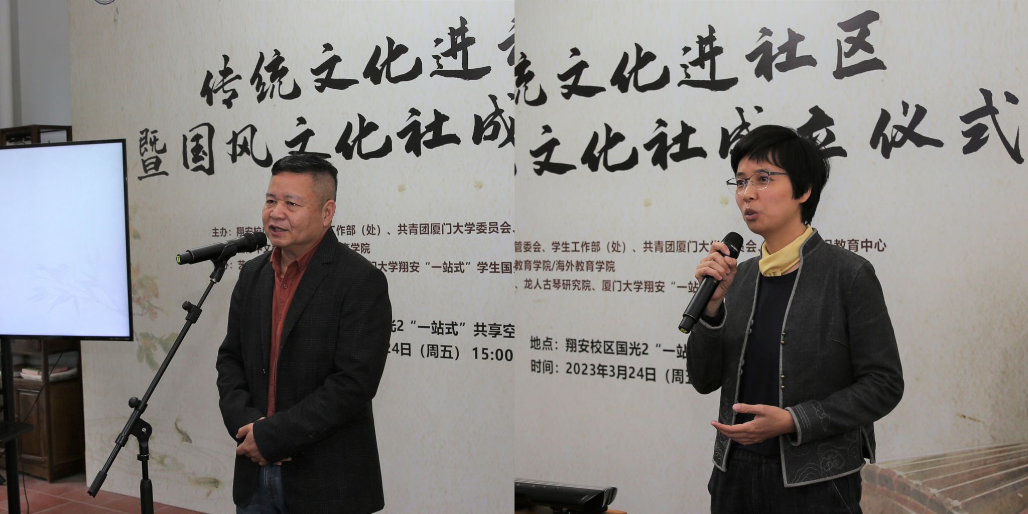 春日厦园,琴韵悠悠。3月24日下午,由翔安校区管委会、学生工作部(处)、共青团厦门大学委员会、美育与通识教育中心、国际中文教育学院/海外教育学院主办,艺术学院、龙人书院、龙人古琴研究院、“一站式”学生社区国光工作组、丰庭工作组协办的“文化大讲堂”第二期——传统文化进社区暨“国风文化社”成立仪式在翔安校区国光2“一站式”学生社区隆重举行。翔安校区管委会副主任马龙、国际中文教育学院/海外教育学院党委书记范丽、学生工作部(处)副部(处)长/翔安校区学生办主任高斌、校团委副书记/翔安校区团工委书记林蕊、艺术学院教授郑盛龙、龙人书院执行院长修少维、龙人古琴研究院副院长张锦冰等参加活动。活动由国际中文教育学院/海外教育学院党委副书记林明华主持。
