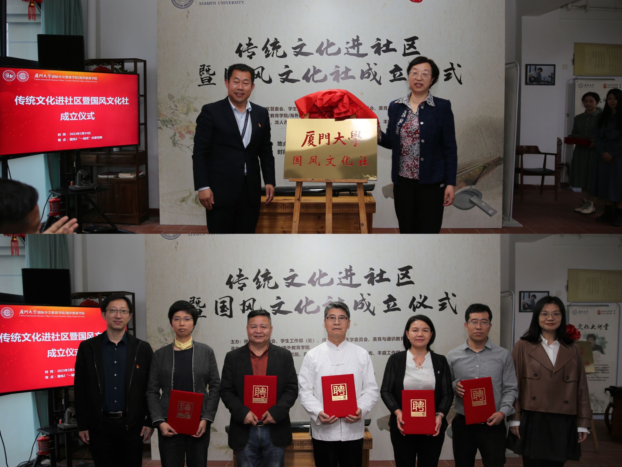 马龙与范丽共同为厦门大学“国风文化社”学生社团揭牌,高斌、林蕊为“国风文化社”指导教师代表颁发聘书。林明华宣读了第一届“国风文化社”骨干成员名单。