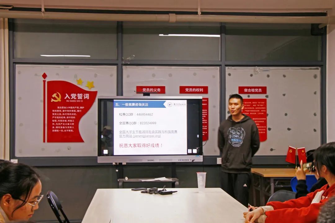 雷雨电学长在介绍这项赛事时讲到,“文稿材料不能有一个错误之处,小组成员要多次审核,认真修改。” 他向同学们介绍了全国大学生节能减排社会实践与科技竞赛的相关流程,分享了参赛作品格式,视频制作等方面的经验以及参赛答辩的小秘籍,并强调制作一份亮眼的视频是决胜初评的法宝。