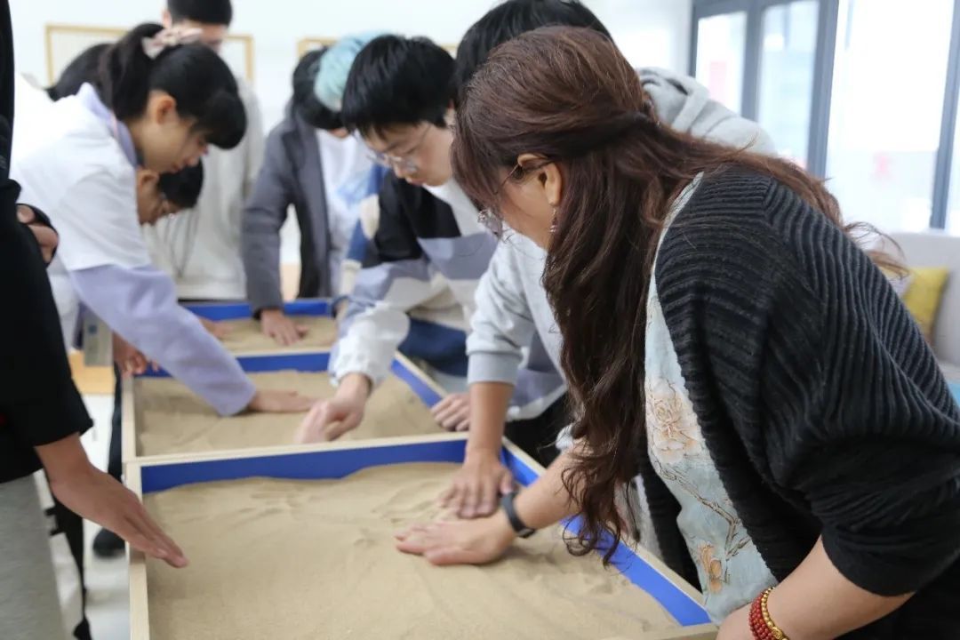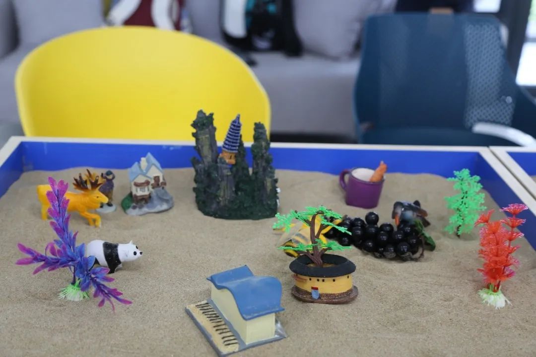 在同学们拿沙具时,老师提醒大家要按顺序,全程保持安静,要用心感受并尊重自己的内心想法,用心对沙盘世界进行构思。在此过程中同学们每次只能做一件事(选择沙具或移动沙具),并且要共同创作,相互感受彼此的内心,最终共同构建一个沙盘世界。