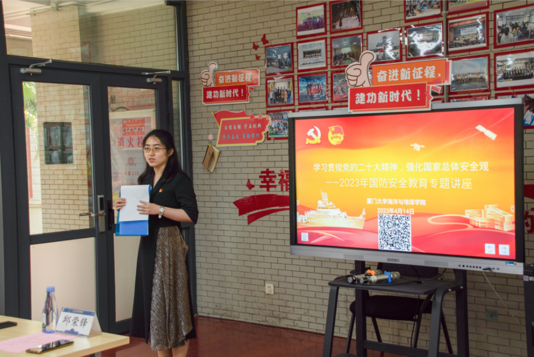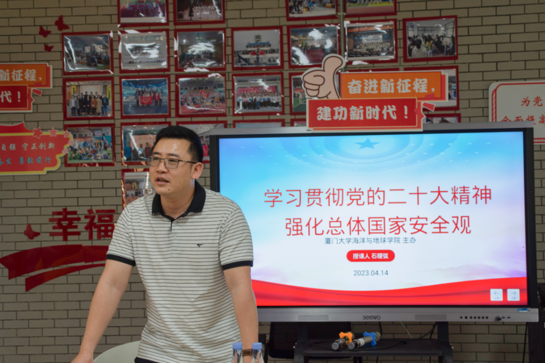 4月15日是第八个全民国家安全教育日。为贯彻落实习近平总书记关于国家安全工作的重大部署,深入学习宣传总体国家安全观,切实提高师生国家安全意识,4月14日中午,海洋与地球学院邀请了厦门市国防教育讲师团讲师石稷弦于海洋之家“一站式”学生社区开展主题为《学习贯彻党的二十大精神,强化总体国家安全观》的讲座。海洋与地球学院党委副书记邱荣锋、党委组织员侯佳君、团委副书记张露月及46名学生党员、团员参加讲座。党政辅导员王冠菲主持讲座。
