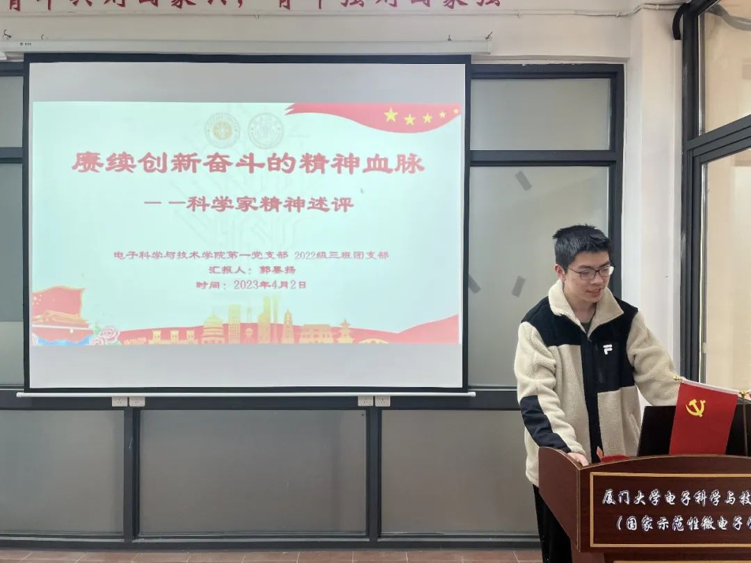 为继承发扬以国家民族命运为己任的爱国主义精神,发扬以爱国主义为底色的科学家精神,4月2日,电子科学与技术学院在博学二“芯创空间”举办以“看万山红遍:厦大青年学习展演中国共产党人的精神谱系”之赓续科学家精神为主题的党建带团建活动。厦门大学电子科学与技术学院本科生第一党支部党员及2022级三班团支部团员参与本次学习。