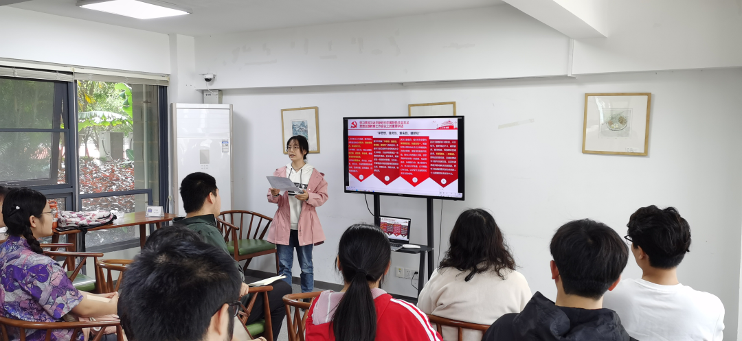 党支部第七小组成员梁朝越分享了自己的学习体会,她认为学习贯彻习近平新时代中国特色社会主义思想主题教育对加强党的思想建设,推动更加深刻领悟“两个确立”的决定性意义,更加自觉增强“四个意识”、坚定“四个自信”、做到“两个维护”,具有十分重要的意义。她从主题教育的根本任务、具体目标、工作安排等方面进行介绍,并号召大家要牢记“学思想、强党性、重实践、建新功”的总要求,坚持学思用贯通、知信行统一,把习近平新时代中国特色社会主义思想转化为坚定理想、锤炼党性和指导实践的强大理想,努力在以学铸魂、以学增智、以学正风、以学促干方面取得成效。