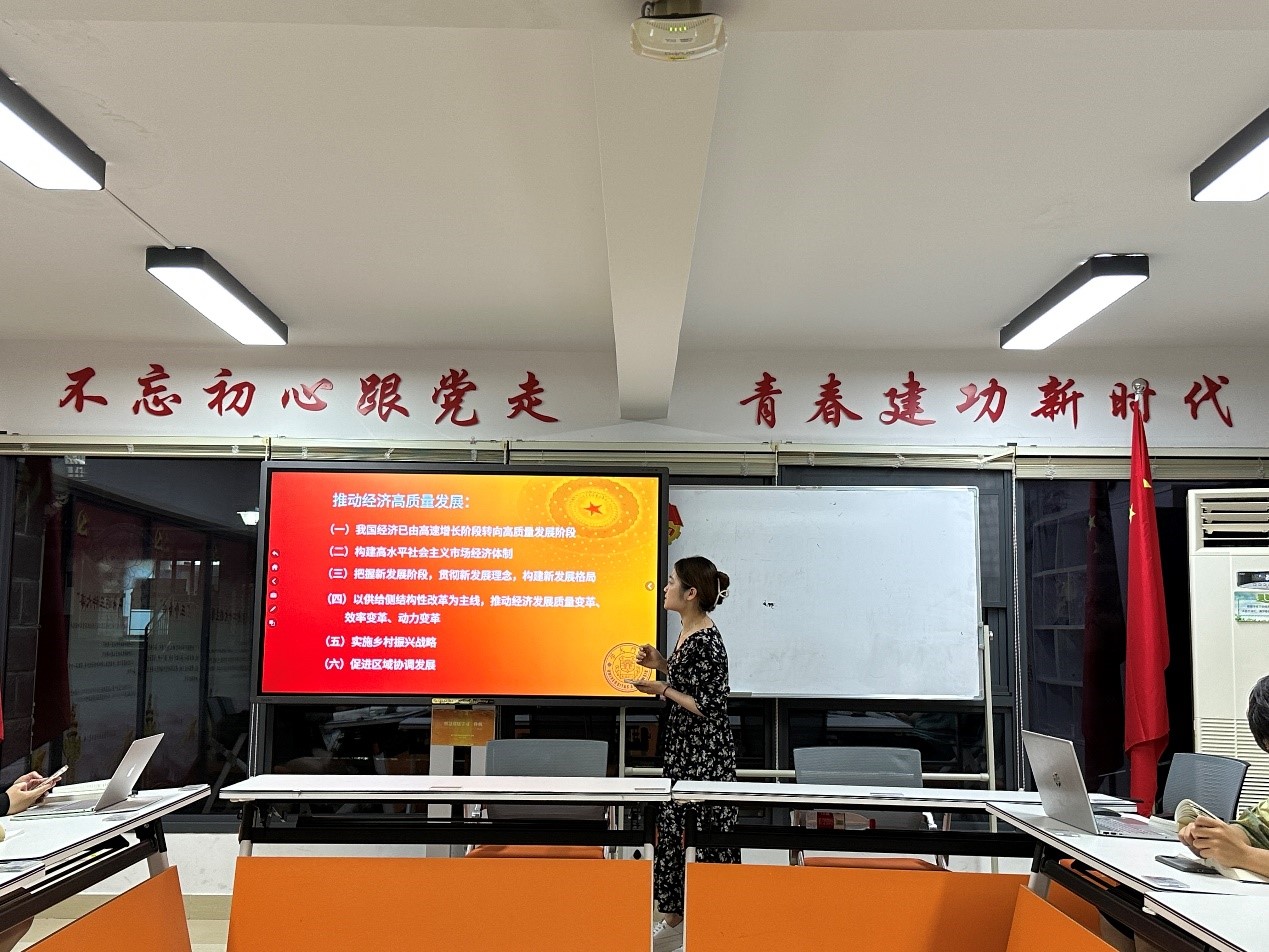 林诗婷同志为我们介绍第五章“推动经济高质量发展”。她主要从四个方面进行分享。首先,为什么必须推动经济高质量发展?推动经济高质量发展是保持经济持续健康发展的必然要求、是遵循经济规律发展的必然要求。其次,什么是高质量发展?高质量发展是坚持以提高发展质量和效益为中心、能更好满足人民日益增长的美好生活需要、体现新发展理念的发展。再次,转向高质量发展是经济发展各层面结构调整优化的宏大系统工程,该阶段不可逆、不能等。最后,全面理解、把握、统筹质量和速度的关系,找到“均衡点”,追求更高质量、更有效益的发展。