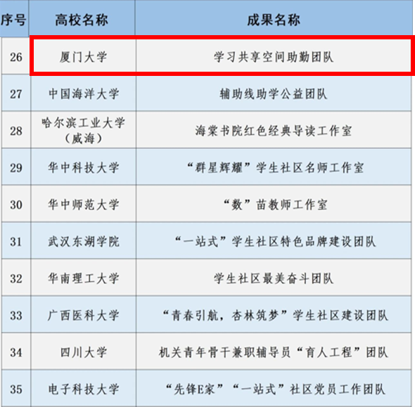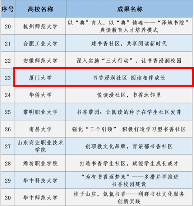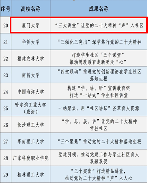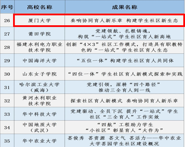 我校推荐报送的《奏响协同育人新乐章 构建学生社区新生态》《“三大讲堂”让党的二十大精神“声”入社区》《学习共享空间助勤团队》《书香浸润社区 阅读相伴成长》4个案例,均获评优秀成果,喜获大满贯!此次风采展示充分展现了我校在“一站式”学生社区建设工作中取得的阶段性可喜成效,形成了具有“厦大经验”的“一站式”学生社区综合管理模式,相关成果将纳入全国高校思想政治工作网资源库,并在“一站式”学生社区综合管理模式建设工作云平台和高校思政网微信公众号进行集中展示。