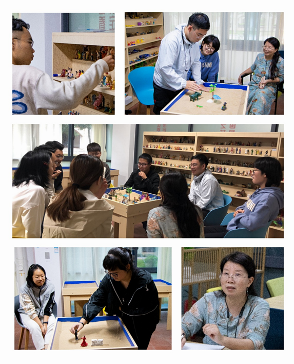 之后,廖老师开始引导同学们开始进行沙盘游戏,沙盘游戏规则看似简单,却能在操作中给与参与者很大的自由进行表现与创造,参与者的内心的世界也伴随着共同的“作品”的制作得以呈现。