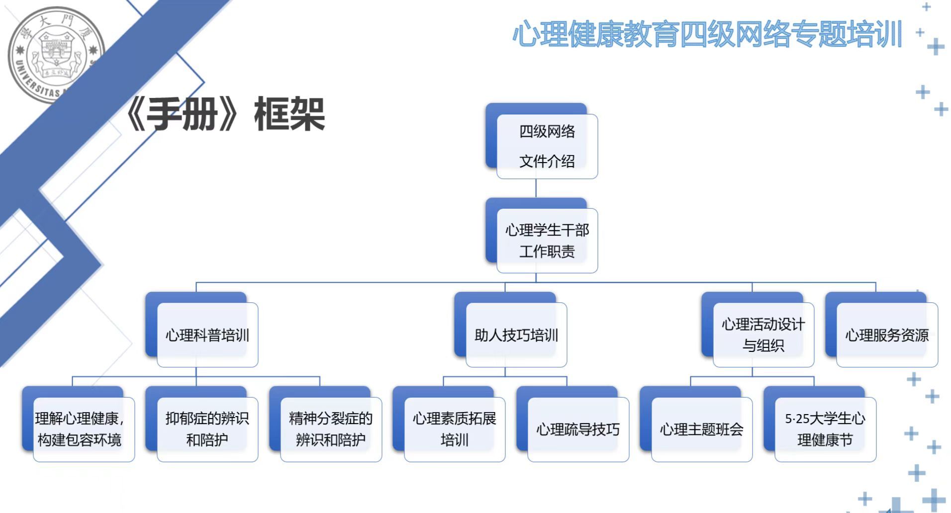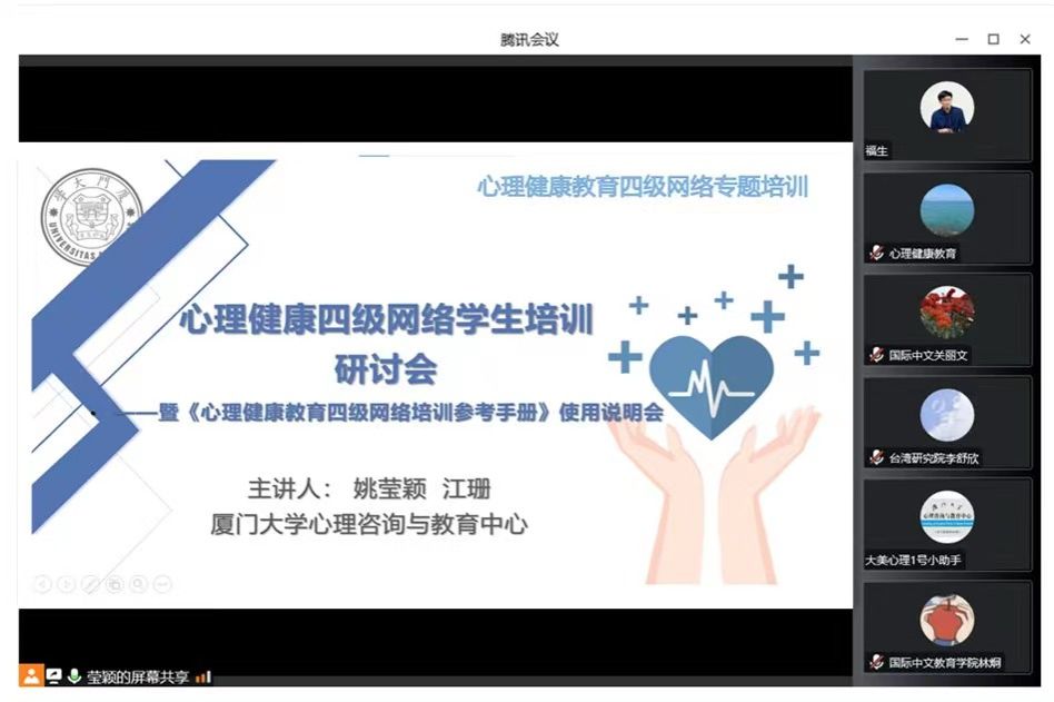 为深化《厦门大学心理健康教育四级网络工作实施方案》的落实,进一步完善“学校-学院-班级-宿舍”四级心理健康教育工作网络培训体系,发挥协同育人的合力,10月15日下午,厦门大学第61期辅导员沙龙在思明校区南光四号楼心理咨询与教育中心一层团体活动室举行,漳州校区、翔安校区的辅导员通过网络视频线上参会。