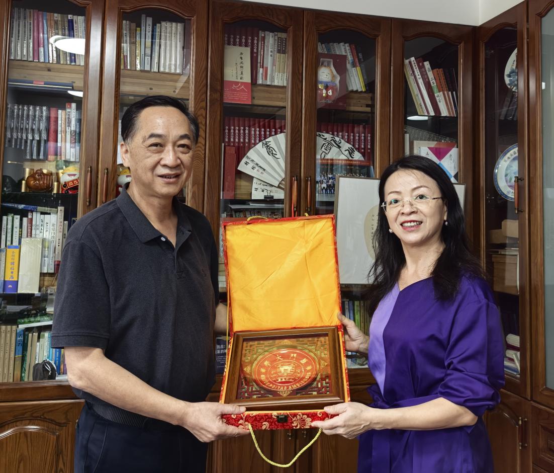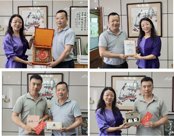 黄宇霞向各位系友介绍了中文系组织架构、师资力量、学生培养与发展等方面的现状,对系友们对母系发展的关注和支持表示衷心的感谢。与会系友纷纷回忆起在中文系求学的岁月,表示在中文系学习打下的扎实的专业基础以及培养的核心语言文字素养,都在日后工作中发挥了重要作用,同时谈及在中文系参与社团活动、创办报刊等的经历,表达了对母校、母系的感恩之情,系友们也对中文系未来发展提出了许多建设性意见。交流活动气氛温馨,其乐融融。陈骋学长代表系友向母系赠送了其父亲陈章汉经典手书福文创双福礼杯,祝福母系发展“满满福气”,蒸蒸日上。