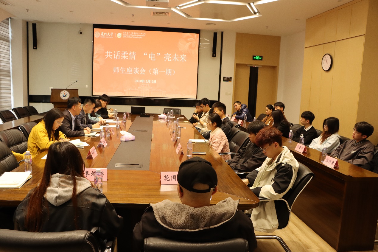 12月12日上午,厦门大学柔性电子(未来技术)研究院首期“共话柔情 ‘电’亮未来”师生座谈会举办。院党总支副书记(主持工作)蒲晓业与19名毕业班学生代表共聚嘉庚实验室3号楼会议室,畅谈学习生活的点滴感受,了解同学们的成长收获,征求大家对研究院事业发展的意见建议,也表达了对同学们的祝福和期待。院团总支书记、辅导员郭建群主持座谈会。